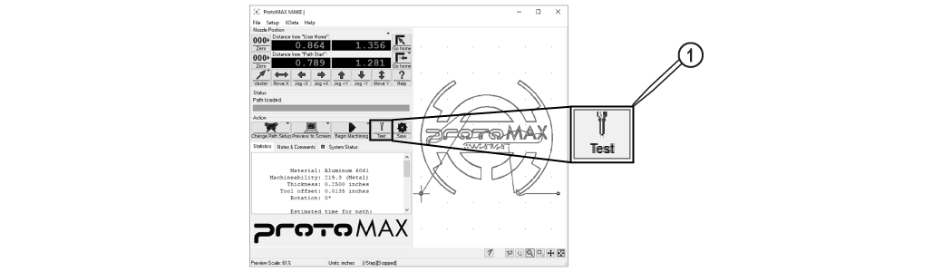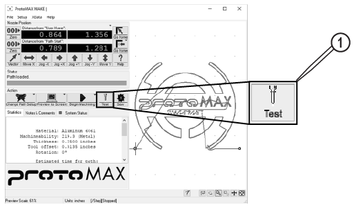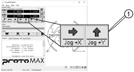 | 6. | In MAKE, use the X, Y Jog buttons [1], or the keyboard arrow keys to position the nozzle between two slats in the center of the cutting deck. |