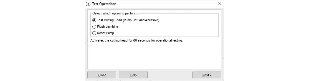 | c. | In Test Operations, select Test Cutting Head (Pump, Jet, and Abrasive), and click Next. |