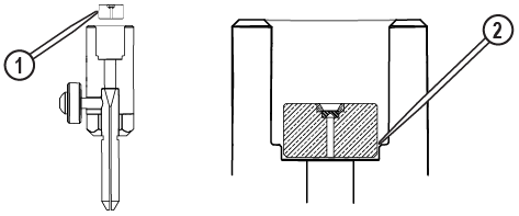 | 10. | Make sure the orifice assembly [1] is seated correctly in the nozzle body chamber bore [2]. |