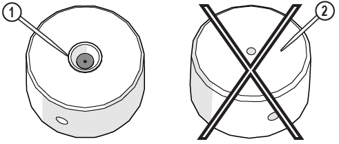 Always orient the orifice assembly so that the brass [1] is visible from the top of the nozzle body. Inserting the orifice assembly in nozzle body in the incorrect orientation [2] can cause damage to the orifice assembly.