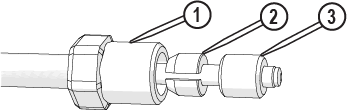 | 8. | Place the slotted collet [2] on the nipple with the tapered end facing the gland nut [1] and thread the collar [3] on the nipple (Figure 95). |